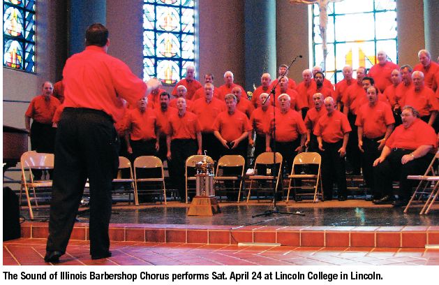 The Sound of Illinois Barbershop Chorus, based in Bloomington, sings at 7 p.m., Sat., April 24, at the grand opening of the new Lincoln Center on the campus of Lincoln College in Lincoln (877-522-5867 or [email protected] for tickets). For the third consecutive year, the 100-member a cappella male group won the Illinois District state crown and gained the honor of representing Illinois at the Barbershop Harmony Society international convention in Philadelphia this July.