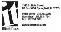 www.illinoistimes.com PUBLISHER Sharon Whalen [email protected], ext.137 EDITOR Fletcher Farrar [email protected], ext.140 Letters to the [email protected] STAFF WRITERS Patrick Yeagle [email protected], ext.122 EDITORIAL INTERN Diane Ivey ................................................divey@illinoistimes.com CALENDAR COORDINATOR Anita [email protected], ext.143 CONTRIBUTORS Amy Alkon, Julianne Glatz, Jim Hightower, Tom Irwin, Jacqueline Jackson, Chuck Koplinski, Dan Perkins, Rich Miller, John Sherffius, Jennifer Fishburn, Roland Sweet SENIOR DESIGNER Joseph Copley [email protected], ext.125 PRODUCTION DESIGNER David Hine [email protected], ext.124 ADVERTISING Beth Parkes-Irwin [email protected], ext.131 Tia Schoen [email protected], ext.128 Nan Bulli [email protected], ext. 129 BUSINESS/CIRCULATION Brenda Matheis [email protected], ext.134