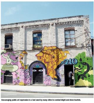 Perkins says the city began cracking down on code enforcement, buying up and seizing blighted properties. The relocation program sells those properties to artists with financing to purchase and rehabilitate existing structures or to build new ones. Empty lots are even available for free to artists with approved plans for new construction, and the city pays up to