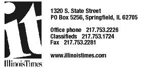 www.illinoistimes.com PUBLISHER Sharon Whalen [email protected], ext.137 EDITOR Fletcher Farrar [email protected], ext.140 Letters to the [email protected] STAFF WRITERS Patrick Yeagle [email protected], ext.122 EDITORIAL INTERN Diane Ivey ................................................divey@illinoistimes.com Jackson Adams.....................................jadams@illinoistimes.com CALENDAR COORDINATOR Anita [email protected], ext.143 CONTRIBUTORS Amy Alkon, Julianne Glatz, Jim Hightower, Tom Irwin, Jacqueline Jackson, Chuck Koplinski, Dan Perkins, Rich Miller, John Sherffius, Jennifer Fishburn, Roland Sweet SENIOR DESIGNER Joseph Copley [email protected], ext.125 PRODUCTION DESIGNER David Hine [email protected], ext.124 ADVERTISING Beth Parkes-Irwin [email protected], ext.131 Tia Schoen [email protected], ext.128 Nan Bulli [email protected], ext. 129 MARKETING INTERN Sara Jacobs .........................................sjacobs@illinoistimes.com BUSINESS/CIRCULATION Brenda Matheis [email protected], ext.134 Published weekly on Thursday. Copyright 2009 by Central Illinois Communications LLC. All rights reserved. Reproduction in any form without permission is prohibited. POSTMASTER: Send address changes to: Illinois Times, P.O. Box 5256, Springfield, IL 62705. SUBSCRIPTIONS: Send $75 a year: (Add $15 per year for overseas delivery.)
