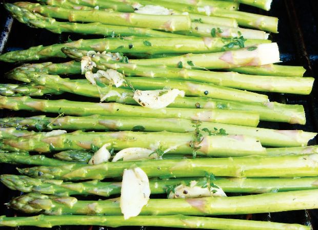 Asparagus — Brush spears with oil and lightly salt them. Thick spears are best to grill individually; if the spears are medium to thin, make “rafts” by lining up four or more spears and piercing them together with a bamboo skewer just below the tips and another 1-2 inches from their bottoms. Either way, keep the tips away from the hottest part of the fire. Grill just until crisp/tender.
