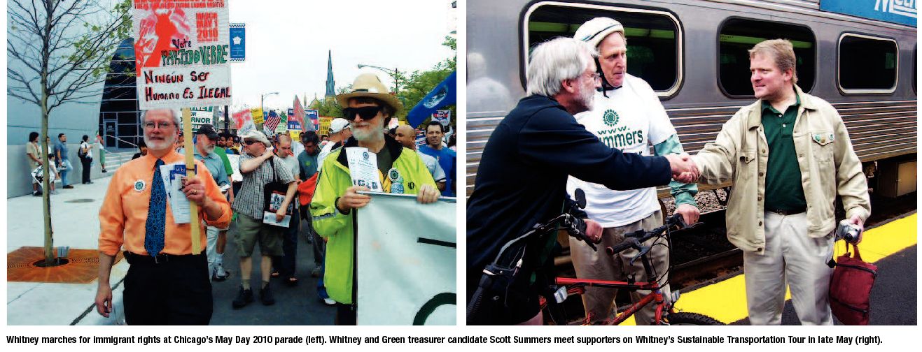 This isn’t Whitney’s first rodeo. He ran as a Green candidate for governor in 2006 against Democrat Rod Blagojevich and Republican Judy Baar Topinka, receiving 361,336 votes — 10.4 percent of the statewide total. Although he didn’t even come close to winning, he did help his party gain “established” status, by getting more than the required 5 percent of votes in a race for statewide office. That means Green Party candidates only have to obtain 5,000 signatures to get on the ballot, instead of the 25,000 required of non-established party candidates. Prior to his first run for governor, Whitney ran for state representative for district 115 in southern Illinois as a Green Party candidate in 2004, losing to Republican Mike Bost.