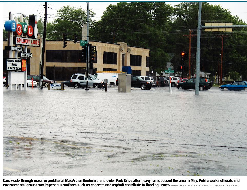 Humphrey and Wallner agree that the blanket of concrete and asphalt that is downtown Springfield contributes to flooding problems. As the rain falls, it travels across those surfaces – parking lots, roads and sidewalks – until it finds a low spot.
