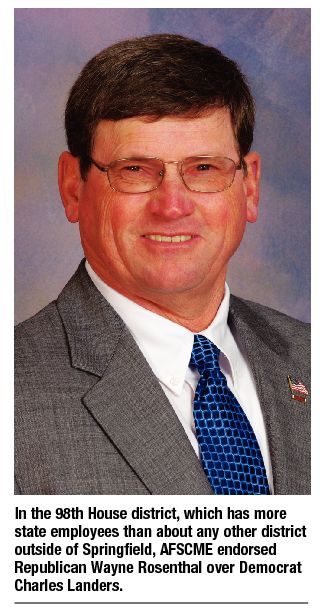 The Democratic-controlled 98th House District has more state employees than just about any other district outside Springfield, and AFSCME went with Republican Wayne Rosenthal over Democrat Charles Landers. Rosenthal has run a nearly perfect campaign to date, and this seat has looked highly vulnerable to a GOP pickup for months.
