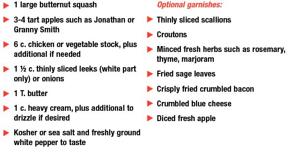 RealCuisine Recipe Butternut squash and apple bisque Peel the squash and scoop out the seeds. Cut into one-inch chunks. You should have about 6 c. Butternut squash vary a lot in size, so if you have less, cut back proportionately on the other ingredients. Peel and core the apples and cut into chunks. In a large Dutch oven, melt the butter over medium heat. Add the leeks or onions, stir to coat, and cover the pan. Sweat the leeks until they are softened, about 5 minutes. Add the squash and apples and pour in the chicken stock. Bring the mixture to a boil, reduce the heat to a simmer, cover the pan, and cook for 20-30 minutes, or until the squash and apples are completely cooked. Purée the mixture with a hand-held blender, food processor, blender or food mill. Cool the mixture before using the blender or food processor – hot ingredients can “explode” in them. Return the mixture to the pan, whisk in the cream and season to taste with the salt and freshly ground pepper. Serve the soup with or without garnishes, as desired. Serves 6. NOTE: This bisque lends itself well to several variations. Add a tablespoon of minced fresh ginger or ginger juice and/or a tablespoon of curry powder, or a tablespoon of chili powder. Substitute yoghurt for the cream (just make sure not to boil the soup after adding it). Sauté 2 T. minced sage, rosemary, thyme, marjoram, or winter savory with the leeks. It also freezes well. See also
