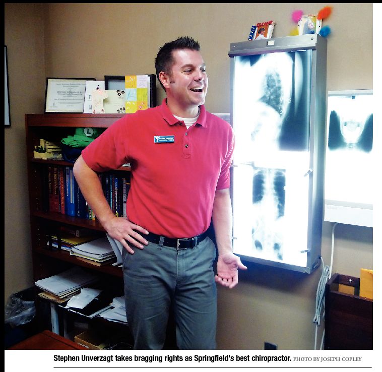 BEST CHIROPRACTOR Stephen C. Unverzagt 1045 S. Second St., 544-3628 Last year, when Stephen Unverzagt was named Springfield’s best chiropractor, he had only been practicing for a few months, out of a small office where he and his wife, Nicole, took care of all aspects of the business, from back adjustments to billing. This year, Unverzagt says with a great sigh of relief as he looks around the office he shares with fellow chiropractor Tim Wenneborg, he has more support staff and more space, meaning he can make more people feel good. He’s also expanded his reach to golfers. With a Titleist Performance Institute golf fitness instructor certification, he’s partnered up with an area golf pro and a local fitness instructor to help golfers extend the time their bodies can take swinging clubs on the golf course.