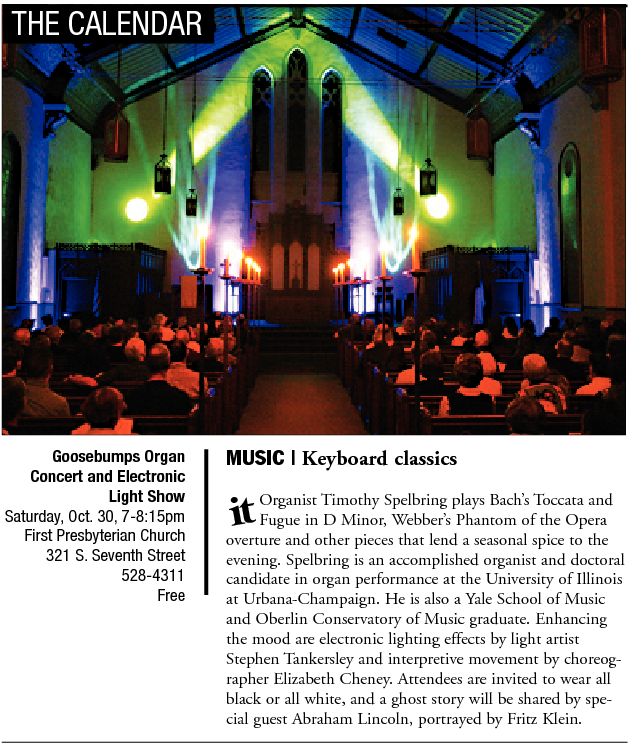 The Haunted Dead Walk Oct 29-30, 7-10pm, Walking tour of Springfield sites that many believe are haunted. 2 1/2 hours for mature audiences only. Reservations and admission required. 502-8687. Springfield Walks HQ, 113 N. Sixth St.