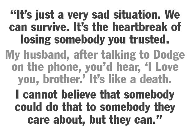 “It’s just a very sad situation. We can survive. It’s the heartbreak of losing somebody you trusted. My husband, after talking to Dodge on the phone, you’d hear, ‘Love you, brother.’ It’s like a death. I cannot believe that somebody could do that to somebody they care about, but they can. If it can happen to us, it can happen to anybody.”