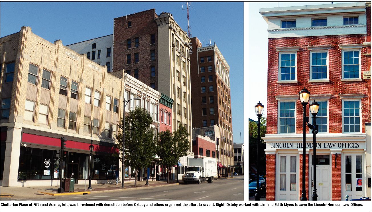 A member of numerous boards and commissions, Oxtoby helped found the Springfield Heritage Foundation which accepts donations of historic properties and matches them with prospective developers who will restore or rehabilitate them.