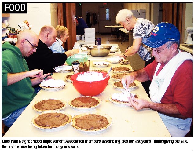 The Enos Park Neighborhood Association offers pecan, pumpkin, Dutch apple, coconut cream, and chocolate cream pies at their Thanksgiving sale. The cost is $13 per pie, and orders will be taken up to Wednesday, Nov., 17. The pies can be picked up on Wednesday, Nov. 24, from 1 p.m. to 5 p.m. at the Elliott Avenue Baptist Church, 501 W. Elliott (one block south of North Grand Avenue). To order, call 638- 8175 or 522-9381, or FAX 522-5557. Contact Steve Combs for additional information at 494-6668 or [email protected].