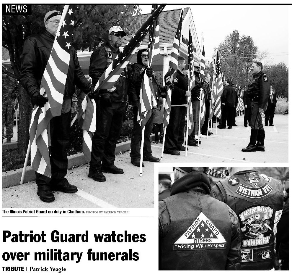 About 100 somber men and women in black leather vests line every pathway in front of the cream-colored funeral home in Chatham. On every vest is a collection of colorful patches proclaiming the wearer’s religion, military service and other affiliations and creeds. Most arrived earlier that day on rumbling motorcycles, and each now holds an American flag as they dutifully pay their respects to the fallen. They are the Illinois Patriot Guard, and they seem ready to live up to their name.