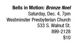 MUSIC | Holiday harmony Still on fire from the fall release of their CD, Bronze Images, Bells in Motion, an experienced group of approximately 15 handbell musicians from around the Midwest, heat up the winter night with holiday harmony. Accompanied by string bass and percussion and directed by Michael Lamb, this concert features Christmas favorites and carols from around the world. (See Holiday Calendar.) See also