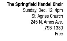 The Springfield Handel Choir, a 56-member local choir, presents the Christmas portion of The Messiah: An Oratorio by Handel under the direction of conductor Janet Lea Cobb-Myers Dec. 12 at St. Agnes Church. The “Hallelujah Chorus” will be enhanced by Fred Greenwald on the trumpet, Jeremy Davidson on the timpani and Dr. See Tsai Chan on the organ. Soloists are Becky Kemp, Susan Hope Harris, Dr. James Greenwald and John Myers. (See Holiday Calendar.)