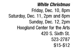 THEATER | Musical classic Springfield Theatre Centre presents a traditional holiday musical for the family. Based on the 1954 film and directed by Leigh Ann Smith, two evening performances and two matinees are planned with audience members having a chance to win gift certificates or a diamond necklace from Denney Jewelers. Additionally on Sunday from noon to 4 p.m., children can have their picture taken with Santa for a $5 donation to the Centre. (See Holiday Calendar.) See also