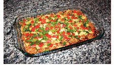 Bake for one hour, or until the top is golden brown, and a knife inserted into the strata comes out clean. If the top begins to get too brown, cover the dish with foil until baking is done. Just before serving, sprinkle the reserved peppers and parsley evenly over the top. Serves six to eight.