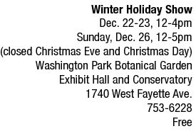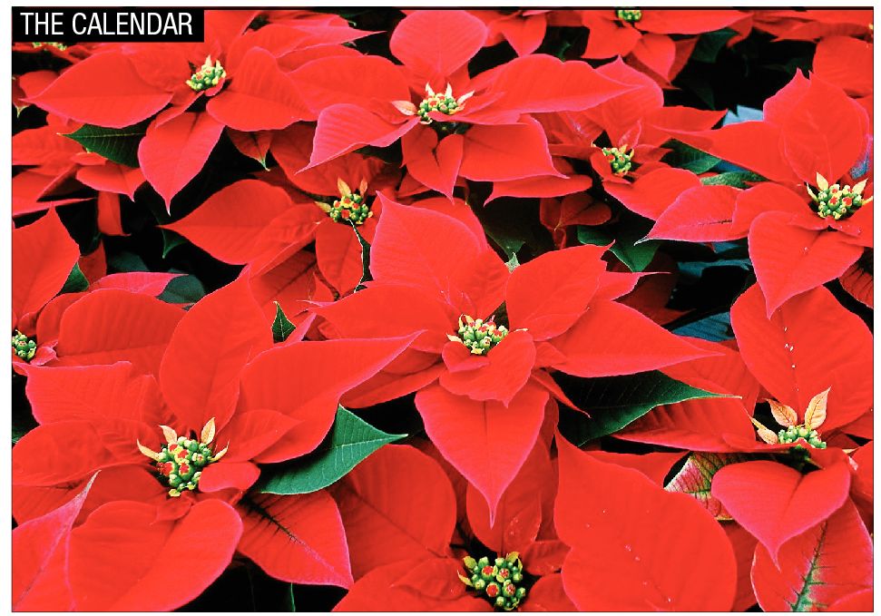 HOLIDAY | Floral forest Washington Park Botanical Garden is a peaceful and delightful place to seek refugee from the holiday bustle. Stroll through the domed conservatory and back room, warm and enclosed from the chill of winter outside. Feast your eyes upon the fine-looking displays of poinsettias and holiday decorations. Return Dec. 29 as Springfield Park District employees tear down the show and you can take home a free poinsettia if you bring a container to hold it in. Park District members get first dibs on the flowers starting at 8 a.m., while non-members may arrive beginning at noon. The giveaway lasts until 3 p.m. See also