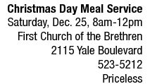 VOLUNTEERING | Christmas compassion Each year members and community volunteers at the First Church of the Brethen open their hearts a little wider and give of themselves on Christmas Day by preparing and delivering meals and holiday hellos to 200 fellow citizens who are alone and unable to leave their homes. Cooking starts at 8 a.m. with meals packaged at about 10 a.m. and delivery at 10:30 a.m. If you desire to help in any capacity, phone the church at 523-5212 or e-mail [email protected]. See also