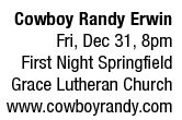 BAND SPOTLIGHT | Cowboy Randy Erwin An accomplished musician on many levels, Randy Skalicky a.k.a. Cowboy Randy Erwin, found his niche several years ago as a yodeler of American western swing music. By learning tricky rope tricks (like lassoing stuff, dude), the Texas native developed an entertaining character who ropes and yodels some sweet oldfashioned tunes from the Wild West. Lest you think this is a passing fancy or hometown hobby, please note that Cowboy Randy is the yodeling voice in the Disney movie Home on the Range, appeared in David Byrne’s film True Stories, has sung at Carnegie Hall, Queen Elizabeth Hall, the Library of Congress, Kerrville Folk Festival, New Orleans Jazz Festival and Ravinia Festival, been heard on NPR, BBC, ABC and CBC, released four internationally acclaimed CDs, composed several film scores and is commonly known amongst the yodeling in-crowd as one of the best purveyors of the genre in the whole wide world. Other than that he grew up on a farm and claims to be one of the foremost rice combine harvester operators known to man, giving him something to fall back on if the music fails to work out. See also
