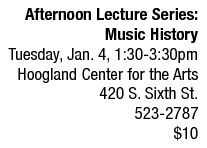 The lectures take place through March on Tuesday afternoons. Each talk costs $10 or if you pay for all four at once the price is $35. Proceeds go to support the HCFTA and the Sangamon Valley Youth Symphony. Register by phone or at hcfta.org.