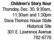 CHILDREN | Reading aloud Reservations are required for this favorite children’s hour story time at the Dana-Thomas House. Three separate times have been made available for little ones to enjoy the fun of the mansion in much the same fashion as would have taken place during the days of Susan Lawrence Dana when she would invite children to the home for a story book reading. Tours of the dwelling, still decorated in its holiday finest, are available all day. See also