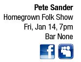 BAND SPOTLIGHT | Pete Sander Here’s the idea: take four singer-songwriters, set them on stage then let them sing their songs and talk about the inspiration behind the tunes. Springfield songwriter Pete Sander participated in a Chicago round robin song swap before creating his Homegrown Folk Show. The first public viewing last month was a smashing success and for January the elated and organized tunesmith scheduled Ben Bedford, Dave Littrell (from the Station) and Ashley Riley (from Jodyboss), each accomplished songwriters outstanding in their respective fields. Sander began looking for ways of self-expression as a teenager then several years later discovered the possibilities of acoustic folk music. Soon he donned a guitar and harmonica and started writing songs and playing gigs. Last year saw the release of his first full-length recording with album number two in the works for an early spring 2011 appearance. Sander, who plays all over town, is now branching out into the Midwest as he solidifies the position of singer-songwriter as an occupation. See also