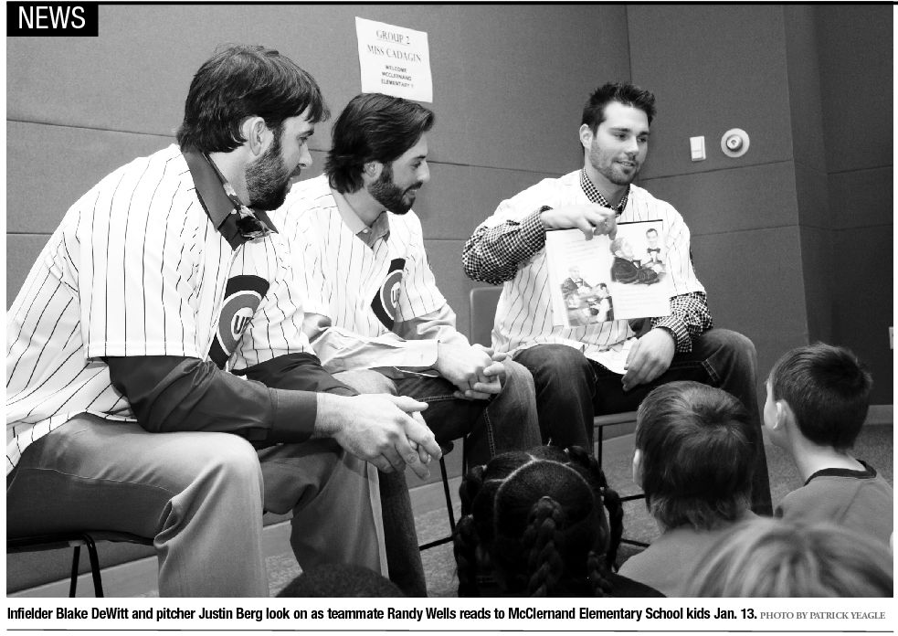 Second grader Taylor Kennedy sits crosslegged in the front row of her classmates as Chicago Cubs second baseman Blake DeWitt reads about Abraham Lincoln’s hat. Leaning forward in his chair, a pair of camouflaged Oakley sunglasses slip from his shirt collar and into the 8-year-old girl’s lap. As he keeps reading, she quickly grabs them, and her face beams as she hands the glasses back to the 2004 first round draft pick.