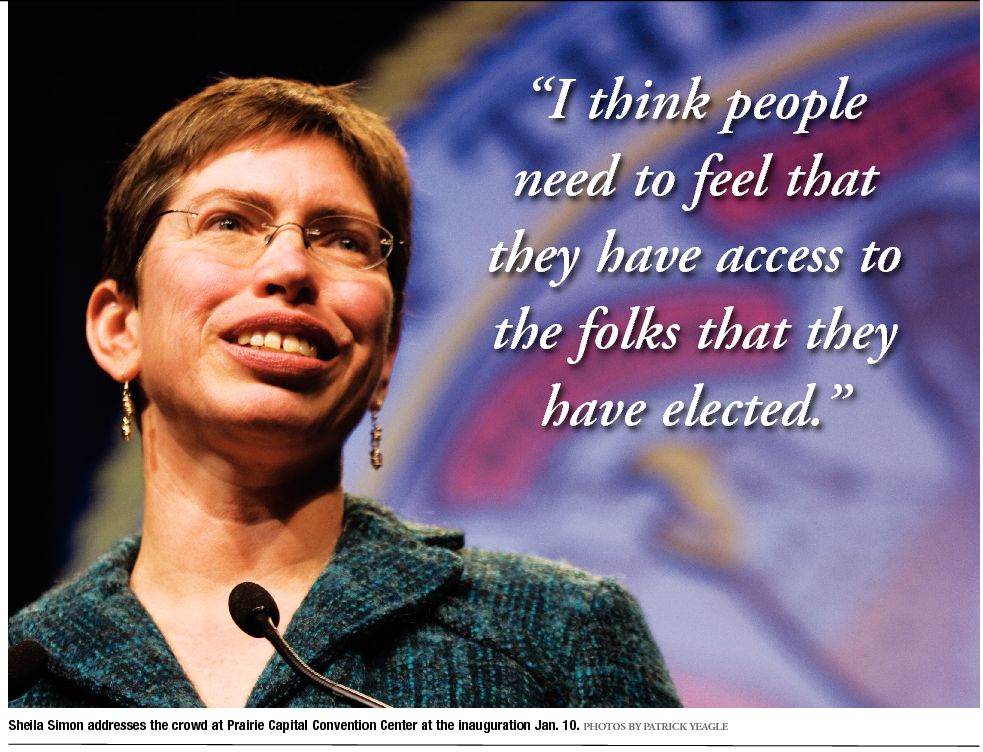 The crowd at the Prairie Capital Convention Center seemed to approve, however, and Simon welcomed her daughter to the inauguration via the Internet, saying “Buona sera, Brennan,” which means “good evening” in Italian. Brennan Knop was able to watch her mother place her hand on the Bible once used by her late grandfather, Paul Simon, as she took the oath of office.