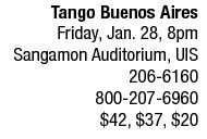 DANCE | Sizzling steps Tango Buenos Aires sizzles on the Sangamon Auditorium stage Jan. 28. The Argentinean dance company was created in Buenos Aires by renowned composer and tango director Osvaldo Requena. Its reputation has grown throughout the world as one of the most authentic and uncompromising representatives of the tango. Emilio Kauderer is its present music director.