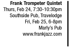 Long a staple on the Springfield music scene, Frank Trompeter continues his marvelous musical march accompanied by a mass of musicians and a bevy of bands. The configuration of the current combo features Trompeter (saxophones, vocals, percussion, sax synthesizer), Chris Miller (piano, organ), Chris Warren (bass), Dion Doss (drums) and A.J. Good (trumpet, flugelhorn). The singing saxophonist leads the basic jazz ensemble through “classic swing standards, mainstream, bebop, hard bop, originals and hybrid arrangements such as swing-plus-ska,” with dashing aplomb and daring ado. Besides numerous shows around town, the band hosts the Jazz Etc., Happy Hour, a steady Friday evening spot at Marly’s regularly featuring area jazz players and singers. On March 5 they open for Trompeter’s multimedia presentation, AV-JAZZaGANZA at Capital City Bar & Grill. From the original formation in 1993 through several personnel adjustments, hundreds of gigs from here to Japan and recordings including 2010’s Gnarly at Marly’s, Trompeter keeps the music coming and going.