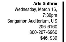 MUSIC | Accents of Americana World-famous folk songwriter and songster Arlo Guthrie performs March 16 in Springfield on his Journey On Tour with special guests The Burns Sisters. Listen to well-known classics such as his 1967 hit, “Alice’s Restaurant,” and the ’72 rendition of “City of New Orleans.” An accomplished musician who plays piano, six and twelve-string guitar, harmonica and a slew of other instruments, Arlo will be accompanied by a full band. Arlo is the son of legendary Woody Guthrie. Explore Arlo’s website at www.arlo.net where he offers chord and sheet music and writes insightful and amusing maxims that are titled “thought for the day.” See also