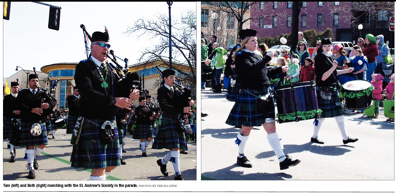 When Tom was “12 or 13” he and other young pipers and dancers left Michigan on a “world tour by bus” of the Expo ’67 in Montreal, West Point, Red Bank, N.J., Washington, D.C., and then finished with a show at Gettysburg. He moved to Chicago in 1982 from Michigan to play in one of the best bagpipe bands in the Midwest and still continues his musical journey that included shows with celebrity performers such as Rod Stewart, the Chieftains and others. During the recent earthquake in Christchurch, Australia, Beth checked on Facebook to inquire about Tom’s piping friends there and found out they were fine.