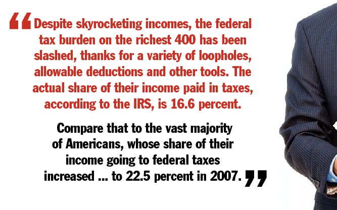 Despite skyrocketing incomes, the federal tax burden on the richest 400 has been slashed, thanks for a variety of loopholes, allowable deductions and other tools. The actual share of their income paid in taxes, according to the IRS, is 16.6 percent. Adding payroll taxes barely nudges that number.