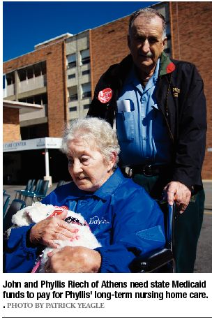 John Riech of Athens speaks softly as he puts his hand on the shoulder of his wife, Phyllis. She is sitting in a wheelchair, slowly petting her small white dog, Sassy.