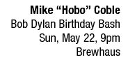 A Decatur native who traveled the country singing songs and meeting folks for years, the trusty troubadour stayed in Austin, Texas, for a spell and spent time in New Orleans before landing in Springfield. A voracious reader self taught in literature and an insatiable scholar of literary folk music, Hobo naturally hosts the Third Annual Bob Dylan Birthday Bash at the Brewhaus, two days before Dylan’s 70th birthday. A staple in the 80s at the Romany Club in downtown Springfield, Coble penned many classic songs, often performed by fellow songwriters, while boasting an aggressively exciting live show. With a generous amount of recordings, but never enough to keep up with the voluminous writing, the constant artist keeps on creating. Joined by fellow Dylan fan and singer-songwriter Joe Dawkins, as well as Jason Perry, Bill Kline, Josh Catalano and regular Sunday night Brewhaus stalwart Tom Irwin, plus those so inclined to hop up and do a Dylan number, Hobo Coble pays tribute to the master while demonstrating his own remarkable abilities.
