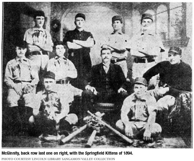 McGinnity joined a Springfield semipro team that “played them all, from Peoria, Decatur, St. Louis, Bloomington or anywhere else,” according to the Nov. 15, 1929, Illinois State Journal. “And before long, he was tossing them over whenever needed, be it once, twice or eight times a week…Those were the days when a ball player was satisfied with a dollar a game and called it a big day if he collected $2 and $3.”