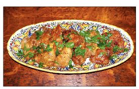Heat the oil in a very large skillet or two smaller skillets over medium high heat. You may need to add a little additional oil, but it shouldn’t be more than 1/8inch deep. While the oil is heating, dredge the chicken pieces in the flour and shake off the excess. Then dip the pieces in the egg mixture, letting the excess drip off. Add to the oil when it is hot but not smoking. Be careful not to overcrowd the pan. It may be necessary to do this in batches, depending of the size of your skillet(s). Cook until the pieces are golden on the outside, turning once. Depending on their thickness, this should only take about 2-3