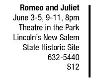 Theatre in the Park, Over the Moon Productions and Lincoln Land Community College present the classic Shakespeare play about love gone wrong in the outdoor amphitheater at Lincoln’s New Salem State Historical Site for two weekends. Directed by Kevin Purcell, the stage combat is choreographed by LLCC associate professor and Society of American Fight Directors member Mark Hardiman. Rochester native Jonah Walker plays Romeo and August Roy of Springfield plays Juliet. Minstrel group, Fealty, and Kevin Purcell host a free pre-show at 7 p.m. Tickets are available online and at the box office beginning at 5 p.m.