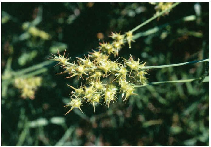 The sand burr seems designed less to exploit passersby in this way than to punish them. The working end of a sand burr is not hooked but hard and sharp. Seen close up, it looks like a ninja throwing weapon. The spines are capable of piercing canvas; picking them off one’s clothes is like being pricked for a dozen blood tests at once. To safely grasp sand burrs you need the kind of leather gloves worn by rose gardeners or hockey goalies, although the prudent man will use pliers.