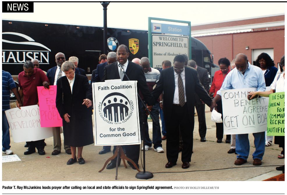 At a June 2 event, McJunkins and the FCCG called on Congressman Aaron Schock, U.S. Sen. Dick Durbin and Illinois Department of Transportation Secretary Gary Hannig to support the Springfield Rail Community Benefits Agreement. The seventiered agreement would include 1 percent of the total rail funding for job training.