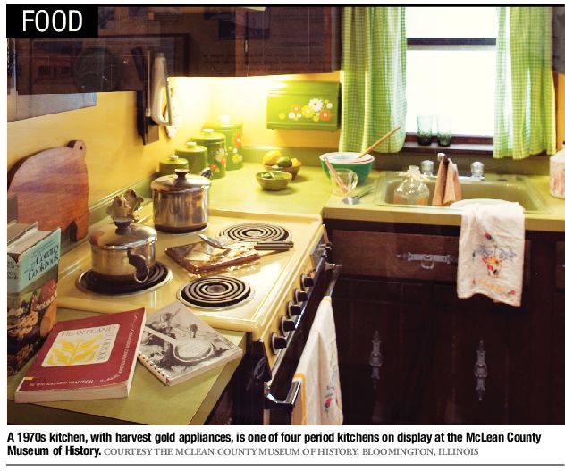 The 1970s kitchen – with harvest gold appliances, of course – has a dishwasher, electric stove and refrigerator with freezer. Other electric appliances have made their appearance: a crock pot, mixer and electric skillet.