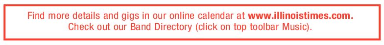Tom Irwin Brewhaus, 9pm-12am. Lady Carole & Her Knights Celebrity Nites Lounge, Decatur, 6-9pm. Open Mic w/ Kyle East End Tavern, Riverton, 3-7pm. Moonlight Bay Karaoke Koo Koo’s Nest, 9pm-1am. Night Life Karaoke Scandals, 8-11pm. Acoustic Open Mic w/ Tim and Fred Trails End Saloon, Curran, 6-9pm. Open Mic w/ Roger Whitsell Walnut Street Winery, Rochester, 4-7pm.