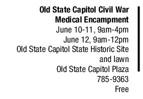 Highlights of the Civil War Medical Encampment include a Friday night campfire singalong at 7 p.m. on the south lawn, led by musicians Chris Vallillo and Steve Staley. Bring a chair. Saturday’s events kick off with a flag ceremony at 9 a.m., then inside and outside of the Old State Capitol listen to live period music, view displays, spend time with reenactors, help children win prizes in a historic scavenger hunt at 10 a.m. and meet Civil War generals and political leaders at 4:30 p.m. Sunday’s closing ceremony begins at noon. Lincoln Home State Historic Site also presents living history activities all weekend. For complete schedules visit www.facebook.com/OldStateCapitolSpringfield and www.nps.gov/liho. The encampment takes place on the 150th anniversary of the United States Sanitary Commission, a civilian group founded to help with army medical efforts during the Civil War.