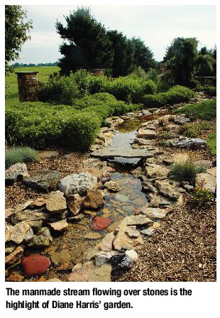 Harris began creating her garden 15 years ago, and the most dramatic feature is a manmade stream flowing through stone imported from Texas. A handsome stone wall borders the water feature.