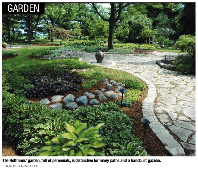 Hoffmans’ garden is full of hostas, lilies and perennials. It has an Asian feel, with many weeping trees, junipers and cypress. Ken designed and built a distinctive gazebo, and there is a water feature based on several large stones.