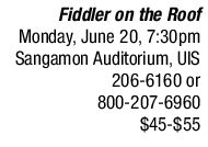 THEATER | The perfect match The touching Tony Award-winning musical about a working man and his wife raising their daughters in revolution-plagued 1905 Russia comes to Sangamon Auditorium June 20. The score includes unforgettable songs “Tradition,” “Matchmaker, Matchmaker” and “If I Were A Rich Man.” John Preece plays the lead, Tevye. Don’t miss this Broadway in Springfield production. See also