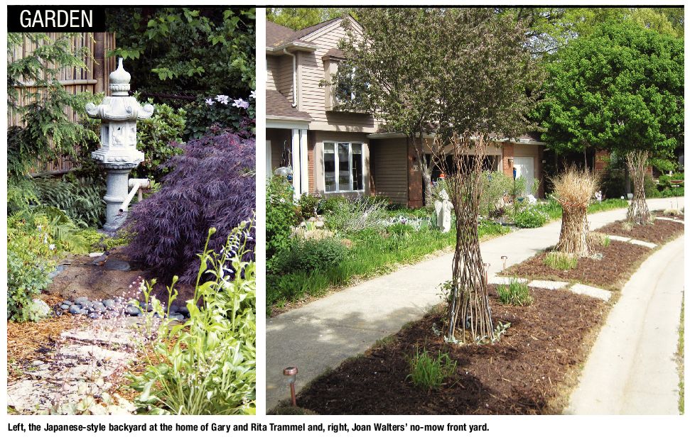 Low maintenance and low-mow is the theme for master gardener Joan Walters’ property at 812 Wood Pointe Drive, Springfield. Joan removed the grass from most of her front yard and her parkway, replacing it with paths, native perennials and yard art. The back yard features moss, serviceberry, dogwood trees, tri-colored beech, laceleaf Japanese maple, and a forest of oak, maple and hickory trees.
