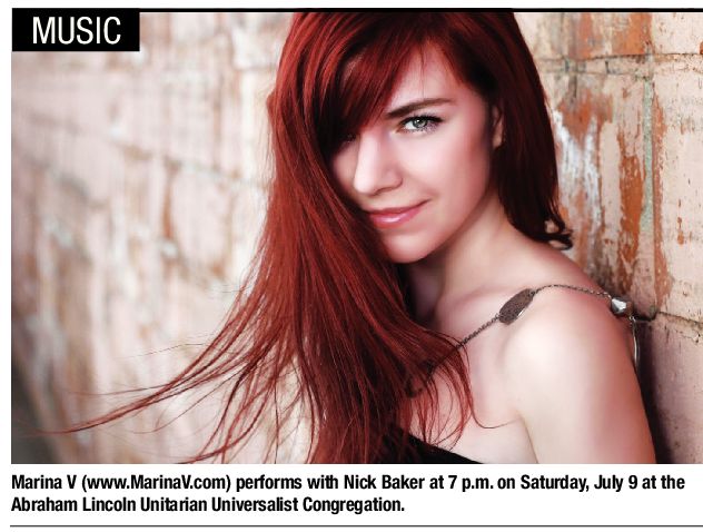 Marina V (www.MarinaV.com) performs with Nick Baker at 7 p.m. on Saturday, July 9 at the Abraham Lincoln Unitarian Universalist Congregation (www.aluuc.org), 745 Woodside Rd, Springfield, Ill., 217-585-9550. All ages welcome, tickets $10, children under 12, $5.