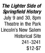 A play about real people and true events that happened in Sangamon and Menard counties such as Springfield's phrenologist Madame Levante who diagnosed folk's troubles by feeling the bumps on their skull. Written by local author and playwright Tara McClellan McAndrew, who brought us the book, Stories of Springfield: Life in Lincoln’s Town. McAndrew and the cast and crew of Theatre in the Park now offer a multimedia show The Lighter Side of Springfield History that highlights the comic and ironic oddities of Springfield history through vignettes, song and narration. Mark Mathewson performs music from the 1800s, and Becca Loschen directs. Free pre-shows at 7 p.m. include Prairie Aires on July 9 and Thistle & Thyme on July 30 and a free talk with the playwright. See also