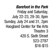 The classic Neil Simon romantic comedy finds a pair of newly married lovers, who embody Oscar and Felix-like traits, trying to live with each other’s idiosyncrasies. Six performances are slated at the Hoogland Center for the Arts for this Gordon Productions play sponsored by Staab Funeral Home and 970AM WMAY. Jenn Wellhausen and Matthew T. Dearing take the lead roles as Corey and Paul. Directed by Rich McCoy and produced by Gus Gordon.