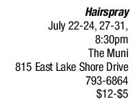 Set in the 1960s, the funny and upbeat musical Hairspray is the next Muni production in the outdoor amphitheater. With big hair, a big body and a large personality, teen Tracy Turnblad lands a spot as a dancer on her favorite television show by the graces of great dancing. She rises to stardom, tackles racially integrating the show, and tries to win over its male heart throb. Tracy is played by Aimee Jarzembowski. Craig Williams directs. Buy and reserve tickets or find a seating chart at www.themuni.org. Tickets can also be purchased by cash or check the night of the performance at the onsite box office starting at 7 p.m. See also
